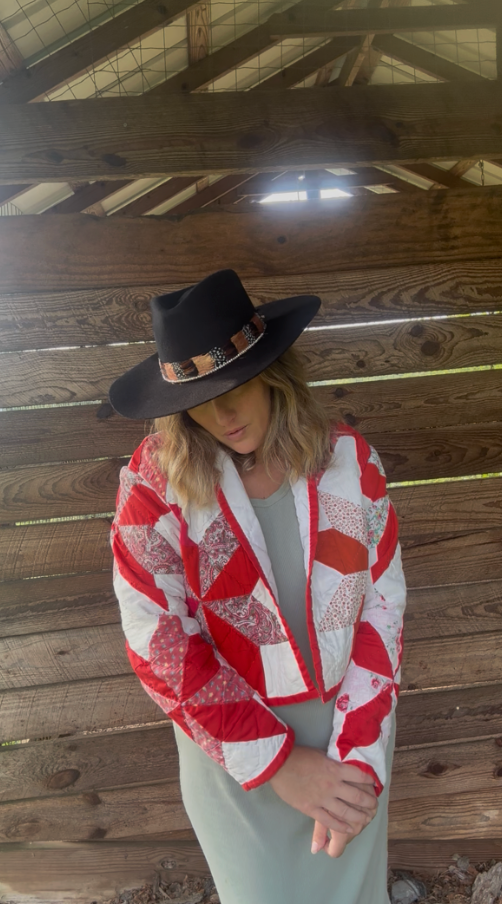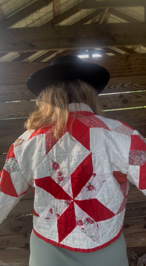 Vintage red, orange and rose pink star quilt. Unlined, lightweight jacket for more mild weather.