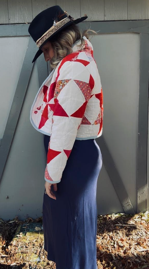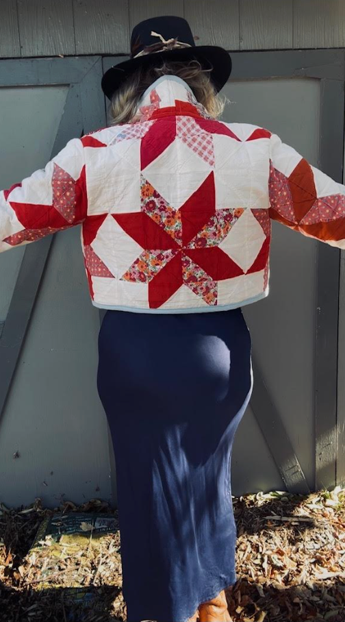 Vintage red, orange and rose pink star quilt. Lined with flannel, this jacket is perfect for colder weather.