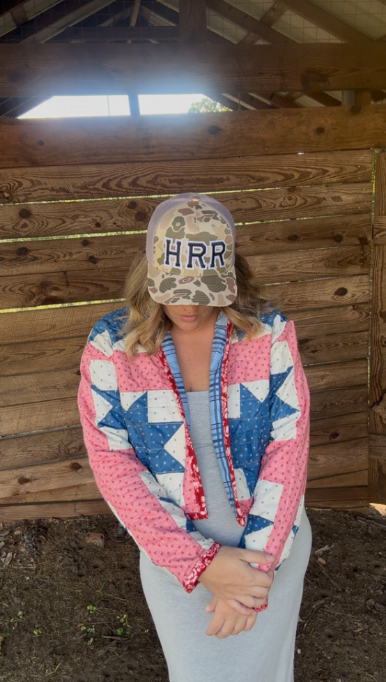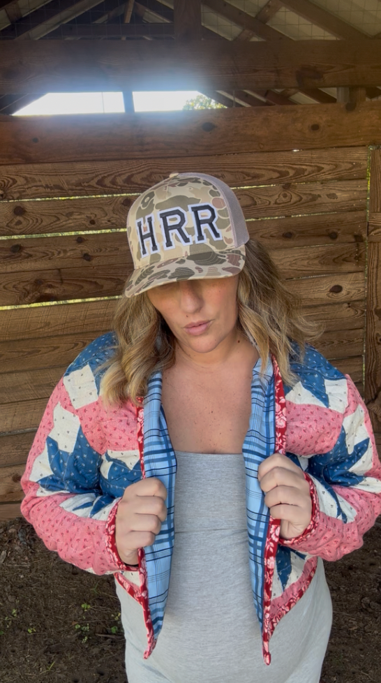 This patriotic quilt is antique and hand stitched. Lined in blue plaid it makes for the perfect light weight option for all year use.