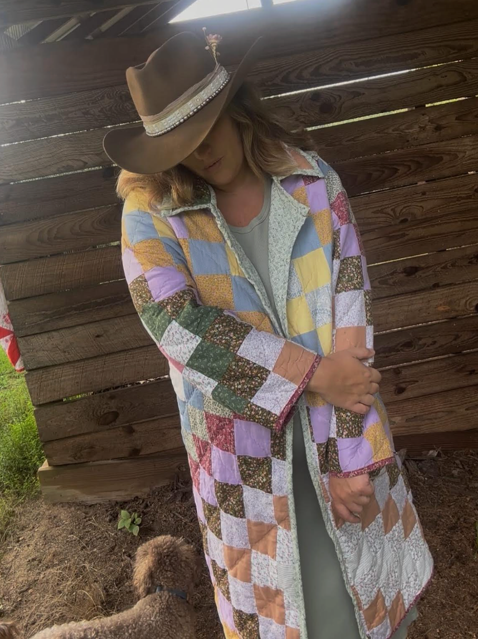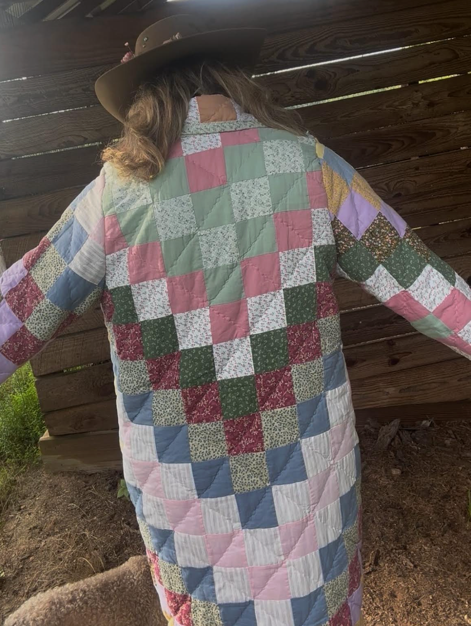 Cream patchwork quilt offers a more subdued option the can be worn fall, winter and spring. Lining is a pale sage green and light weight.