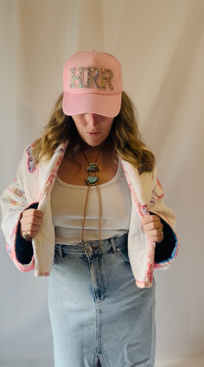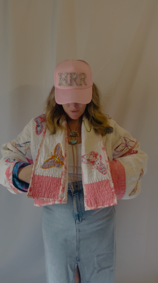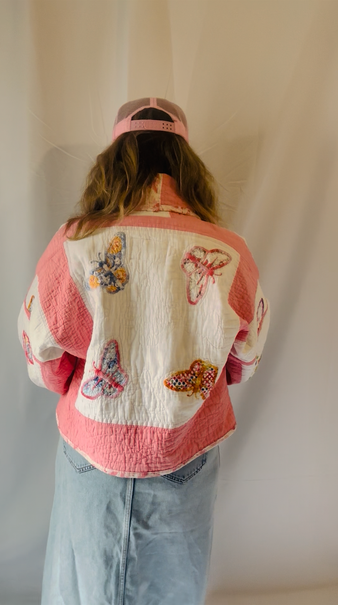 Pink and white hand stitched quilt with butterfly applique. The Winnie style is a one size fits most as the shawl collar can be folded and sleeves cuffed.